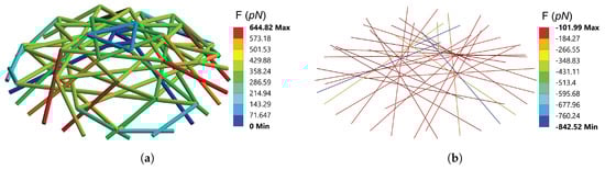 The axial force in the cytoskeletal components when indentation distance reaches 2 μm: (a) distribution of axial force in AFBs (b) distribution of axial force in MTs.