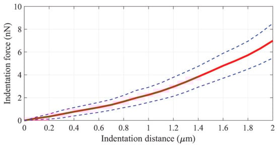 In the F-D curves, points from 0 μm to 2 μm at the μm increments were sampled to quantitatively evaluate the similarity between the computational and experimental F-D curves by . Figure 10 depicts the averaged pre-processed experimental F-D curve derived from the fourteen experimental F-D curves measured by the AFM, together with the ± standard deviation (SD).