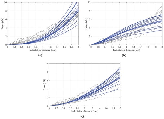 Figure 5a illustrated the relationship between the NP and CP. With the CP selected, the experimental F-D curves were trimmed from the zero point to the maximum force point, or the point before the penetration point [,] if possible. In addition, the length of the trimmed F-D curve was larger than 2 μm, so that the final length of the smoothed F-D curve would not be smaller than 2 μm.