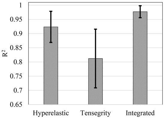 Figure 11 presents the results with the highest similarity in the computational F-D curves calculated by the hyperelastic model, the ten-level tensegrity model, and the integrated model, to the experimental F-D curves. In addition, the average values and the standard deviation of achieved by the models are presented in Figure 12.