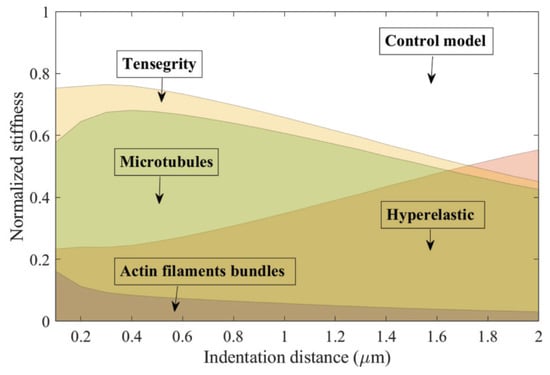The normalized stiffness curves show that, at small indentation, the ten-level tensegrity structure dominates the mechanical behaviour of the cell, contributing approximately 75% of the local stiffness. As deformation increases, the percentage of the local stiffness attributed to the hyperelastic components correspondingly increases. The hyperelastic components dominate the response when the indentation distance is over μm, on average. Within the tensegrity structure, the local stiffness attributed to the AFBs is overwhelmed by the contribution from the MTs during the indentation, regardless of the overall deformation.