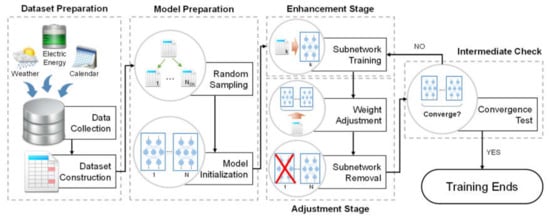 Here, t is the real electric energy consumption data and yi is the estimated energy consumption by SNi. Without interfering with each other, all subnetworks learn their own datasets to minimize the loss function. Meanwhile, the ensemble weights are fixed and unable to affect the training in this stage. If all subnetworks are trained Epochenh times, this stage is completed, and the next stage, i.e., the adjustment stage, commences.