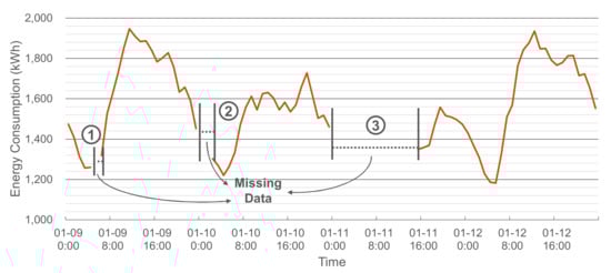However, guaranteeing accuracy in the energy consumption data is not trivial because there are several factors that result in missing data [,]. For example, malfunctions of the device and signal transmission errors are typical sources of missing data []. This missing value problem decreases the prediction accuracy and results in inferior performance for the forecasting methods that are based on consecutive values, such as the autoregressive integrated moving average [,]. A popular approach to resolving this problem is to replace the missing values with plausible values, which is known as missing-value imputation.