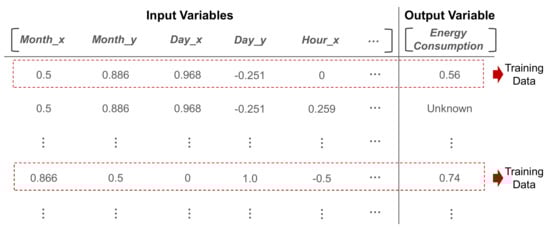 The calendar data requires preprocessing. First, we determined the season, month, day, hour, minute, and day of the week through the timestamp. Here, the minute is not considered if the measurement period is equal to or longer than 1 h. Second, the time units, such as a month, day, and hour, were preprocessed to reflect the periodicity [,] using Equations (1) and (2), where time is the time unit we want to transform and periodtime is its period. For example, periodtime will be 12 if we convert the month, while periodtime will range from 28 to 31 if we convert the day of the month. Third, season and day of the week are represented by one-hot vectors. Finally, two variables are added to indicate whether the measurement time is obtained on a working hour of the management target or on a holiday. After the calendar data is preprocessed, 26 input variables are prepared; these variables and the output variable are listed in Table 1.