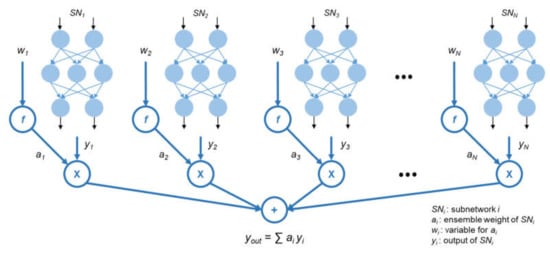 Figure 4 shows the structure of the ensemble model. N subnetworks are created after the sampling, and each subnetwork SNi, i = 1, 2, 3, …, N, additionally has an ensemble weight ai. ai is used to calculate the result of the ensemble model, yout, which is a weighted average of the output of each subnetwork yi. However, for ensuring that yout is the weighted average, the ensemble weights must satisfy the following two conditions: (1) all ensemble weights must be contained in the interval from zero to one (ai ∈ [0, 1]); (2) the sum of the ensemble weights must be one (∑ai = 1). While designing the deep learning model, it is difficult to identify a method to train the model while satisfying these two conditions. However, a softmax function used primarily in classification tasks always satisfies these conditions. Hence, we decided to apply a softmax function and adopt a new variable wi to determine ai. The softmax function is defined as Equation (3). Owing to the property of a softmax function, the ensemble weights always satisfy these two conditions. Therefore, in the model training, ai is not directly adjusted; however, wi is adjusted instead of ai. The change of wi affects ai such that we can determine the proper value of ai. In the remaining sections of this paper, we express that we directly adjust ai for convenience.
