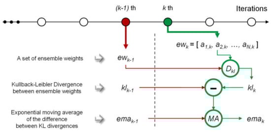 Here, we explain the condition that is checked in this stage. As machine learning models do not require more training when they converge, we assume that the ensemble weights are not changed if the models converge. The calculation flow for checking is described in Figure 5. Here, we denote all ensemble weights at the kth iteration of the training stages as ewk = [ai,k, a2,k, …, aN,k]. As described in Section 2.2, the ensemble weights satisfy the two conditions owing to the properties of the softmax function, which also follows the properties of a probability distribution. Thus, we treat ewk similarly to a probability distribution. By the given assumption, when the ensemble model converges, there is no difference between ewk and ewk−1. To measure the difference, we use a Kullback–Leibler divergence (KLD), which is a measure of the difference between two probability distributions. KLD will be low when the given probability distributions are similar, and KLD becomes zero if the two probability distributions are exactly the same. Conversely, KLD will be large when the probability distributions vary significantly. Therefore, we should determine k when the KLD value between ewk−1 and ewk, denoted by klk, is zero. Equation (6) shows the equation of klk, where Dkl(x||y) indicates KLD between two probability distributions x and y.