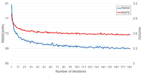 Figure 6 and Figure 7 represent the test error changes and klk and emak changes at each iteration, respectively. At early iterations, the test errors rapidly decreased. At the same time, klk varied from approximately 0 to 0.2. However, the test errors and the emak started to converge in the middle of the iterations, while the range of the klk variations was reduced, and the klk tended to become small according to its trend line. After the 181st iteration, the emak became zero, and the model training was concluded. It can be observed from Figure 6 that there were only a few benefits in terms of accuracy errors or the number of subnetworks, even if the model training continued.