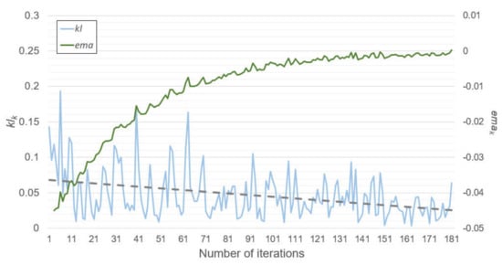 However, it is challenging to use the difference between klk and klk−1 as the criterion because empirically this difference becomes zero after a few iterations. The reason why this is problematic is that it leads to the shortage of training time for each subnetwork; this results in inaccurate imputation. Hence, we adopted the exponential moving average of the difference to ensure sufficient training time for the subnetworks. The exponential moving average at the kth iteration, emak, is calculated according to Equation (7).
