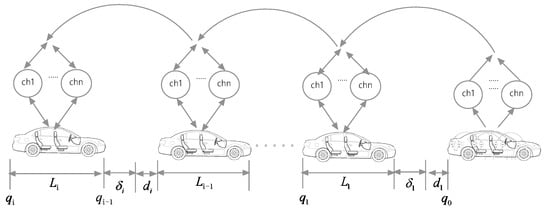Consider the vehicle platoon in Figure 1 and let Li, qi, vi and ai be the length, position, velocity and acceleration of the ith vehicle in the platoon for i = 0,1,…,N, where i = 0 stands for the leading vehicle. In this figure, δi is the spacing error and chj stands for the jth wireless channel for j = 1,…,n. For the ith vehicle in the platoon, the longitudinal dynamics can be described by [,]