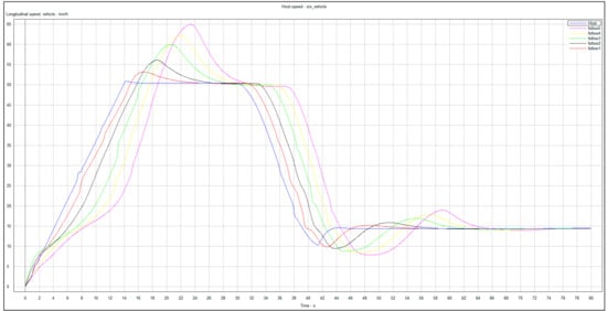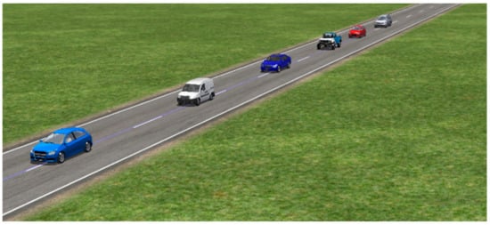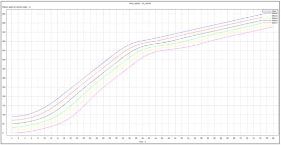 In order to further demonstrate the effectiveness of the presented CACC method, we use the CarSim2016.1 software to evaluate the stability performance of the control method. The software is a high-fidelity simulation environment with an interface for MATLAB/Simulink. In this experiment, six heterogeneous vehicles are used to make up a vehicle platoon which is shown in Figure 4. The vehicle types of the six vehicles are selected as C-Class Hatchback, European Van, F-Class Sedan, Off-Road Pickup, B-Class Hatchback, and D-Class Minivan, respectively. These different cars will be used to illustrate the applicability of the proposed CACC method to heterogeneous vehicle platoon. The velocity and acceleration of the leading car and simulation parameters are selected to be the same as the aforementioned MATLAB numerical experiment. The remaining parameters of these vehicles, e.g., the mass, transmission system and other parameters are selected to be the default values of the software.