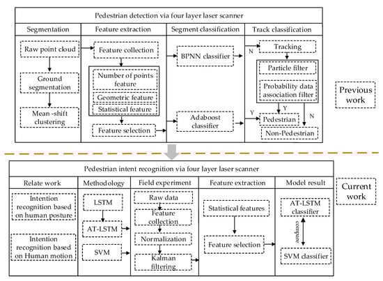 A mature vehicle-pedestrian intention recognition system must include pedestrian detection, tracking, and pedestrian intention recognition. Previous research [29] by the authors has provided a relevant analysis of pedestrian detection and tracking and achieved accurate detection and tracking of pedestrians. The recognition of pedestrian intention is the focus of this work on the basis of the previous research. As shown in Figure 1, this work can be divided into five parts. Section 1 presents the research background and related work which currently can be categorized as research that is based on posture language and research that is data-driven. Section 2 discusses research methodology, in which the AT-LSTM and support vector machine (SVM) algorithms are introduced along with algorithm parameter setting and model input variables. Section 3 details the parameters of pedestrians and vehicles, which are mainly collected by four-layer laser scanner and HD camera, followed by data normalization and filtering processing. Section 4 provides statistical analysis results of characteristic parameters. In this part, the variables closely related to pedestrian crossing intention are determined through statistical analysis. In Section 5 the results of recognition at 0 s and 0.6 s in advance using the two models are analyzed and the performance of the model with specific evaluation metrics is determined.