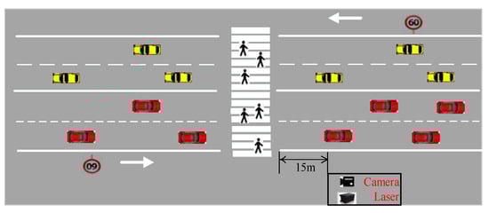 The zebra crossing selected in this paper is located at the west gate of Chang’an University and crosses Wenyi South Road. The width of the zebra crossing is 12 m, and it is located in a straight section of the two-way road with four lanes with a small and negligible slope. There is no signal light control at the site, a double yellow line in the middle of the road, and no refuge island, green belt, or monitor capturing device above the road. Approximately 30 m away from the zebra crossing there are signs for pedestrians and schools. The speed limit of this section is 60 km/h and the speed limit is set 100 m away from the zebra crossing. A sketch of the experimental section is provided in Figure 3. The traffic flow of the zebra crossing is mainly composed of taxis and private cars, accounting for more than 95% of the traffic, and the remaining traffic is predominantly buses and minivans. Traffic flow is about 600 veh/h in rush hours and 400 veh/h in non-rush hours.