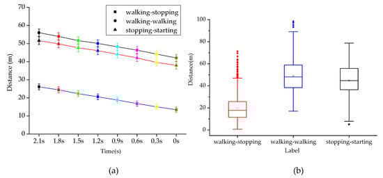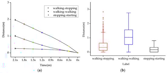 Distance between pedestrians and zebra crossings under different crossing intentions. (a) Distance between pedestrians and zebra crossings at different times and with different intentions. (b) Mean distance between pedestrians and zebra crossings under different crossing intentions.