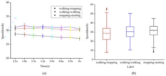 As shown in Figure 7b, when the intention of pedestrians is walking-stopping, the mean speed of vehicles is 29.94 km/h; when the intention of pedestrians is walking-walking, the mean speed of vehicles is 30.61 km/h; when stopping-walking is the intention of pedestrians, the mean speed of vehicles is 31.21 km/h. The one-way ANOVA test shows that the mean vehicle speed under different intention labels displays a significant difference (F (2,15840) = 83.69, p < 0.001). The post-hoc comparisons are shown in Table 4. It can be seen that the mean vehicle speed under walking-stopping and walking-walking is significantly different (p < 0.001); the mean vehicle speed under walking-walking and stopping-starting have no significantly different (p = 0.15 > 0,05); the mean vehicle speed under walking-stopping and stopping-starting are significantly different (p < 0.001).
