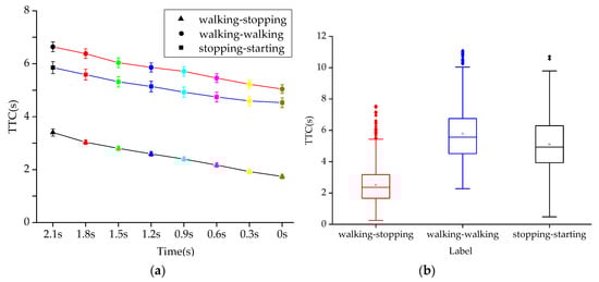 As shown in Figure 8b, when the intention of pedestrians is walking-stopping, the mean TTC is 2.51 s; when the intention of pedestrians is walking-walking, the mean TTC is 5.79 s; when the intention of pedestrians is stopping-walking, the mean TTC is 5.11 s. The one way ANOVA test shows that the mean TTC value under different intentions is significantly different (F (2,15840) = 1719.60, p < 0.001). The post-hoc comparisons are shown in Table 6 and post-hoc comparisons are provided in Table 2. It can be seen that the mean TTC under walking-stopping and walking-walking, the mean TTC under walking-walking and stopping-starting, and the mean TTC under walking-stopping and stopping-starting are all significantly different (p < 0.001).
