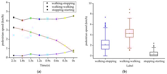 The event labeling guidelines proposed in this paper carry out identification the instant that a pedestrian starts or finishes an activity. In this work, pedestrian crossing intention is divided into three categories: walking-stopping, walking-walking, and stopping-starting. Specifically, a walking-stopping activity is defined as the action when the pedestrian gets closer to the zebra crossing and the speed of the pedestrian decreases and finally becomes 0 km/h, stopping in front of the zebra crossing. Walking-walking activity is defined as the action when pedestrians cross the street directly without any stop and the speed is always greater than 0 km/h in the process. A stopping-starting activity is defined as the action from the initial standstill in front of the zebra crossing to the beginning of a pedestrian’s motivation to cross the street. This criterion was adopted because these transitions are easily labeled by human experts, thus enabling the creation of reliable ground truths.