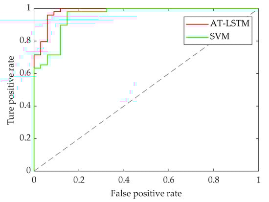 The following Figure 11 shows the receiver operating characteristic (ROC) curves of the two recognition models, in which the curves deviate far from the 45° oblique line. The results illustrate that both models have good recognition performance.