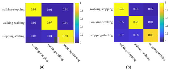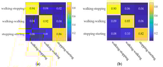 Using the above process, a total of 1980 effective samples were extracted, which included 680 walking-stopping groups, 658 walking-walking groups, and 642 stopping-starting groups. The process of model recognition is thus essentially a three-class classification problem.