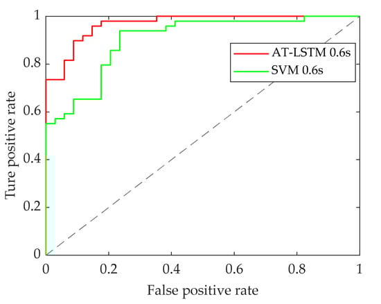In this experiment, a total of 1980 effective samples were collected, 80% of which are used as training sets and the remaining 25% as test sets for model training, as shown in Table 11. The AT-LSTM algorithm is predominantly used for model training, and the SVM algorithm was used for model accuracy comparison. An analysis of the accuracy of the model to recognize the intention of crossing 0 s in advance and 0.6 s in advance is the primary focus of this work.