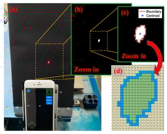 In gray processing, the origin Red-Green-Blue (RGB) image in Figure 1a can be converted into a grayscale image by calculating the average of three components (R, G, B value). Because the intensity value of grayscale image has a range of 0~255, in the binarization processing, a set threshold value could make grayscale below this value equal to 0 and above this value equal to 1. As shown in Figure 1b, the laser spot is white after this process.