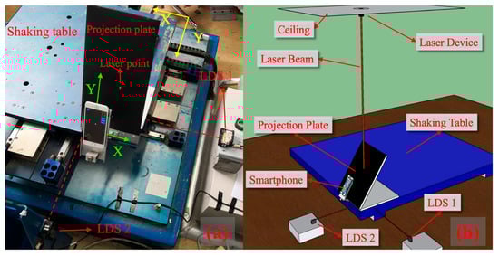 Inspired by some of the referenced studies [,,], a laser device was installed on the ceiling with a laser spot projected on the floor. If the movement of this laser spot could be recorded, the interstory drift could be identified. The shaking table test was conducted to simulate the relative movement between ceiling and floor (the floor represents the shaking table in this paper). Under this condition, using the method in paper [], the laser spot’s movement was recorded through a smartphone camera. However, if the smartphone is parallel to the floor to shoot the laser spot on the floor, this laser spot might be sheltered by smartphone. As a result, a projection plate was designed to not shelter the laser spot. Meanwhile, the smartphone recorded the laser spot’s movement. In order to verify the method, laser displacement sensors (LDS) were used as a reference. The experiment scheme is shown in Figure 2.