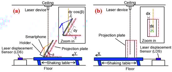 As shown in Figure 3, the laser light path was not sheltered by the smartphone when the vibration was fierce. From two zoom-in pictures in Figure 3, the relationship between the movement on the floor of the laser spot and the movement on this projection plate could be identified through Equation (2):