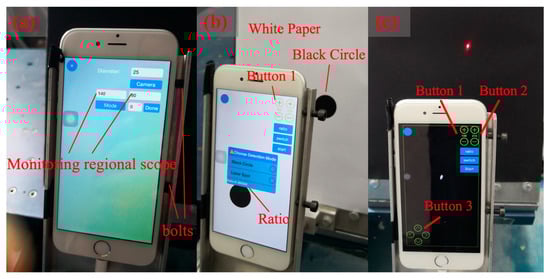 In the measurement phase, withdraw the calibration paper and start the monitoring interface, as shown in Figure 4c. Adjusting button 2 to change the threshold value until the laser spot shown on the app interface becomes small enough. Then, press the “switch” button and press the “3” button to move the monitoring regional scope. This adjustment should make the laser spot locate at the center of the monitoring regional scope. Finally, click the “start” button to start measurement.