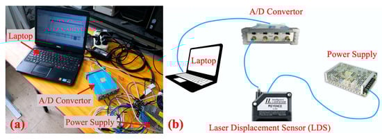 In order to verify the method, two LDS were used as a reference to measure the displacement of the shaking table in two directions. The LDS measurement system is made up of a laptop, an A/D converter, a power supply, and two LDS, as shown in Figure 5. The power supply provides direct current to LDS. Then, the LDS senses the laser waveform change after the laser reflected by the measured object, and this signal is converted from an analog signal to a digital signal by the A/D convertor. Finally, the digital signal is recorded by software on a laptop.