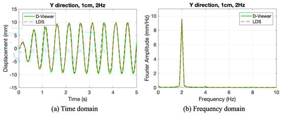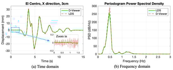 The time-domain monitoring results of the seismic wave excitation test are shown in Figure A3 and Figure A4 in Appendix A. There is only one of those results taken as an example, and the results of #12 are shown in Figure 7a in the time domain. In the whole time history, the smartphone is in concordance with LDS. The measuring range of the smartphone could reach 30 mm. Apart from these, local details can be found in the zoomed-in picture. It was observed that the smartphone had a lower fluctuation than LDS, which means the smartphone is more accurate in terms of measurement. The discussion of accuracy and error is in Section 3.5.