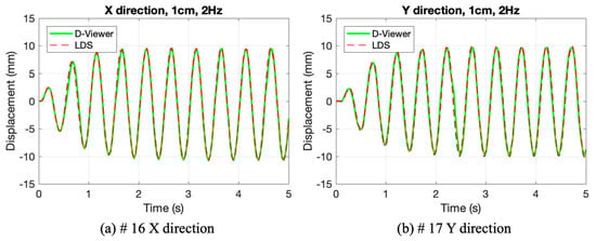 Although the monitoring results show that the D-Viewer aligns well with LDS, a small deviation still exists at the maximum or minimum displacement value, which will be discussed in this section. Because displacement amplitudes were different between each experiment, percent error was used to calculate the deviation at the first wave crest of each test. The percent error is defined as the ratio of relative error to the results of the LDS. As shown in Figure 9, the mean value of percent error of all the experiments in Appendix A is 3.37%, with a standard deviation of 2.67%. However, the mean value and standard deviation in the two directions are not the same. The mean value of the percent error in the Y direction is almost half of the X direction. The reason for this might be the real displacement in the X direction is almost half () of displacement on the projection plate in the Y direction, and the relative error is also almost half.