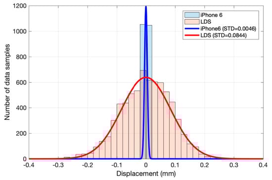 In addition to the errors at the maximum value, errors at a stable period around 0 mm were also evaluated []. The zoomed-in picture in Figure 7 has already exhibited a small variation of the smartphone. In this part, to describe the error quantitatively, the monitoring data of a period 70 s were used to evaluate the accuracy of the method. Figure 10 shows that the error approximately follows a normal distribution. Therefore, the normal distribution is used to fit the data. The mean values of the two methods are mm (iPhone 6) and mm (LDS), respectively. The value is so small that it can be recognized as 0 mm. In addition, the standard deviations (STD) of two methods are 0.0046 mm (iPhone 6) and 0.0844 mm (LDS), respectively. These values were used to draw two continuous normal distribution curves, as shown in Figure 10 in different colours. With smaller STD value, the results of the iPhone 6 are more concentrated, which means iPhone 6 has lower fluctuations in monitoring.
