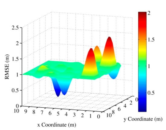 The accuracy of all algorithms was evaluated through the root-mean-square error (RMSE) between the estimated location and the actual one in this paper. Figure 2 shows the error distribution of the OMCT algorithm in different positions when the channel number was 16, the multipath number was 2, and the coordinates of the anchor nodes were (2,0), (10,3), and (1,10).
