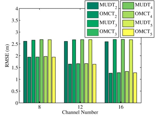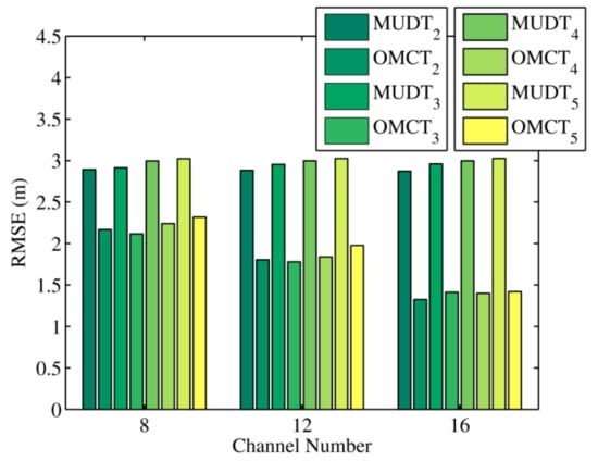 The RMSEs of MUDT and OMCT under different channel numbers in the simulation.