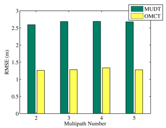 The RMSEs of MUDT and OMCT under different multipath numbers in the simulation.