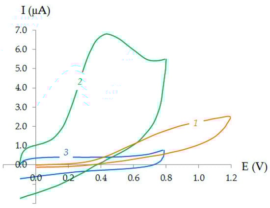 Figure 1 shows cyclic voltammograms on Au-gr/CVE in the PBS, pH 7, not containing and containing 0.1 mM AA. It can be seen from Figure 1 that on the cyclic voltammogram (curve 3) at Au-gr/CVE in PBS, there are no anodic and cathodic signals. The introduction of AA into the background electrolyte led to the appearance of a poorly expressed, small anodic wave of AA on CVE (curve 1) and a clear signal three times larger in size on Au-gr/CVE (curve 2). In this case, the potential of the AA oxidation current on Au-gr/CVE was shifted more than 0.4 V to the cathodic region, compared with that observed on CVE.