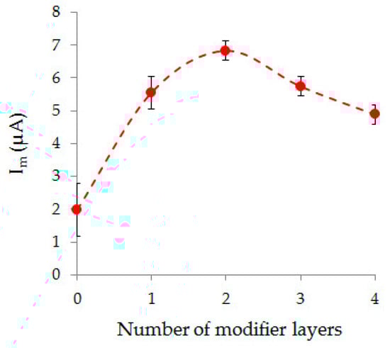 The dependence of AA oxidation current on Au-gr/CVE on number of Au-gr layers deposited on the CVE surface is shown in Figure 2. It can be seen from Figure 2 that the largest AA current was obtained on CVE modified with two Au-gr layers. Obviously, one Au-gr layer is not enough to obtain the highest current of AA, and the sequential deposition of more than two Au-gr layers leads to the gradual formation of a macro-gold coating on CVE and a decrease of the active gold surface, which causes a decrease of AA current. Therefore, CVE was modified with two Au-gr layers.