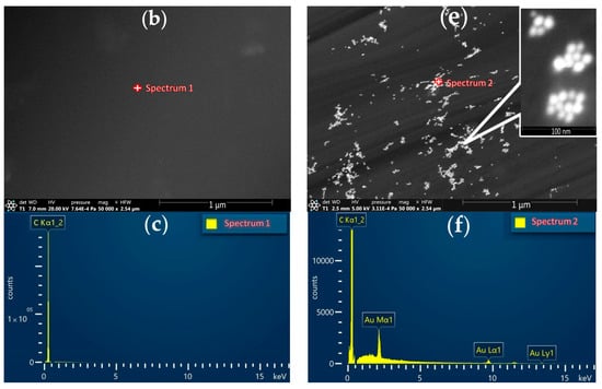 Figure 3 shows micrographs of the CVE and Au-gr/CVE surfaces obtained by SEM. As can be seen from Figure 3a, the CVE surface is randomly interwoven fibers (5 to 10 μm diameter), with a binder in some parts of which. As can be seen from the EDS spectrum, the main element of CVE is carbon (Figure 3c). The Au-gr/CVE surface consists of fibers with a whitish coating (Figure 3d), which, at a higher magnification, are identified as single small bright points 10–15 nm in size and their associates 30–40 nm in size (Figure 3e). Au-gr/CVE EDS spectrum (Figure 3f), recorded in the bright spot, confirms the presence of gold in it.