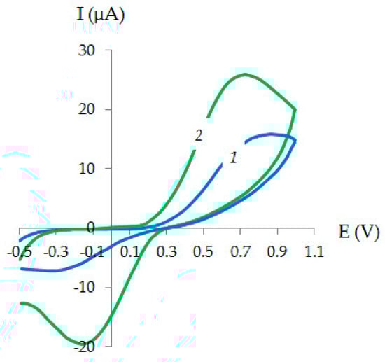 Cyclic voltammograms of 1 mM [Fe(CN)6]4− on CVE (1) and Au-gr/CVE (2) in 0.1 M KCl. ν = 0.05 Vs−1.