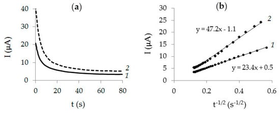 Figure 5 shows chronoamperograms of K4[Fe(CN)6] oxidation at a potential 0.7 V on CVE and Au-gr/CVE (Figure 5a), as well as the dependences I = f (t−1/2) (Figure 5b). As can be seen from Figure 5b, the slope of the linear relationship I = f (t−1/2) for Au-gr/CVE is two times greater than for CVE. The effective surface area of the electrodes was calculated using Cottrel ecuation [] and the above-mentioned data. Thus, the area of CVE appeared to be 15.6 mm2 and 32 mm2 for Au-gr/CVE.