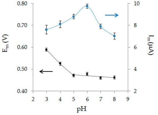 The obtained slope value is 0.059 V, which corresponds to the theoretical value [] for the process in which the same number of protons and electrons takes part. As can be seen from Figure 6, the highest oxidation current of AA is observed at pH 6; therefore PBS with a pH of 6 was used as the background electrolyte for further studies.