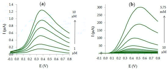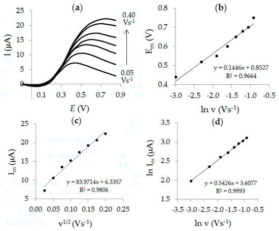 Figure 7a shows that influence of the potential scan rate in the range from 0.05 to 0.40 Vs−1 on the AA current and the oxidation potential. As can be seen from Figure 7c, the AA peak current increases and its potential shifts to an anodic region with an increase in the potential scan rate. The shift of the AA oxidation potential to the anodic region with the scan rate increase (Figure 7b) is characteristic of the irreversible electrode process [] and can be expressed by the corresponding Equation (2):