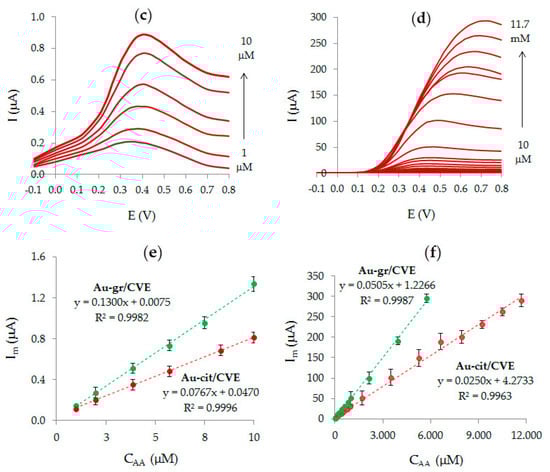 The dependence of the peak current on AA concentration on Au-gr/CVE and Au-cit/CVE is shown in Figure 8. As can be seen from the Figure 8e,f, the slope of the calibration curves for Au-gr/CVE is higher than that for Au-cit/CVE, which testifies the higher sensitivity of Au-gr/CVE (0.13 µAµM−1) compared to Au-cit/CVE (0.05 µAµM−1).