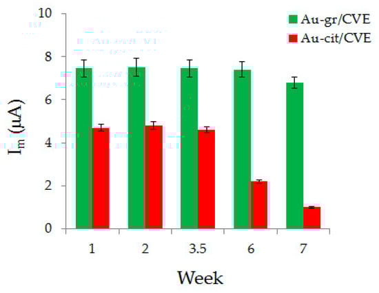 0.1 mM AA response on the proposed sensor is stable for 6 weeks, which is shown on the diagram (Figure 9). As can be seen from the diagram, 0.1 mM AA oxidation current on Au-gr/CVE does not change for 6 weeks, but by the 7th week, it is reduced by 8%. On Au-cit/CVE, the 0.1 mM AA response is stable for 3.5 weeks and decreases by almost 50% by the 6th week.