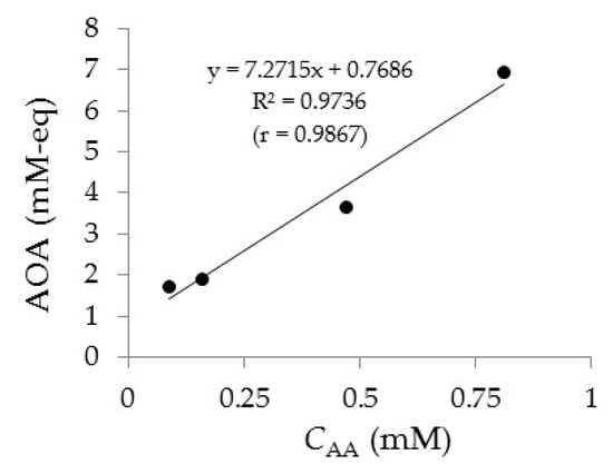 The relationship between AA content in juice samples and their antioxidant activity (AOA) is shown in Figure 10. Assessment of AOA drinks was carried out by the potentiometric method described in []. A good correlation is observed between the determination results of AA by the voltammetric method on the Au-gr/CVE and AOA value of the fruit juices samples. The correlation coefficient is 0.9867 (Figure 10).