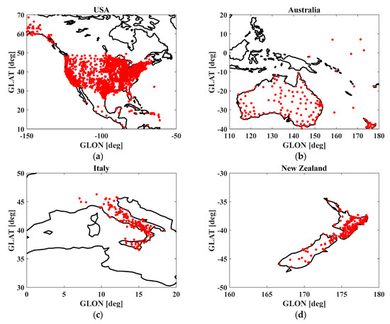 Continuously operating reference station (CORS) networks that provided the data used in this work. (a) USA CORS network; (b) Australia CORS network; (c) Italy CORS network; (d) New Zealand CORS network.