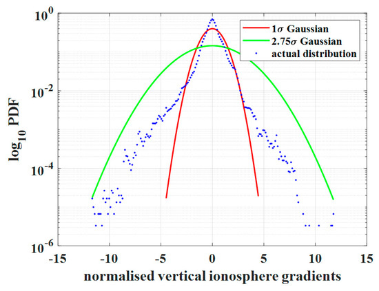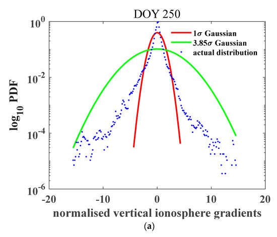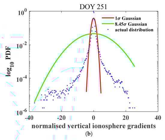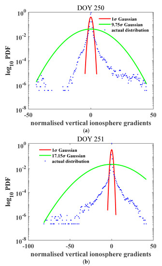 Probability density function of the ionospheric gradient derived during the geomagnetic storm period (a) 09–07 corresponding to day 250 of the year; and (b) 09–08 corresponding to day 251 of the year; the storm occurred at midnight on 8 September. The red curve indicates the 1σ Gaussian distribution PDF, the green curves indicate the bounded Gaussian distribution PDFs with inflation factors of 9.75 (a) and 17.15 (b), and the blue dots are the real gradients derived from observables. The inflation factor increased drastically due to the influence of the geomagnetic storm on 8 September.