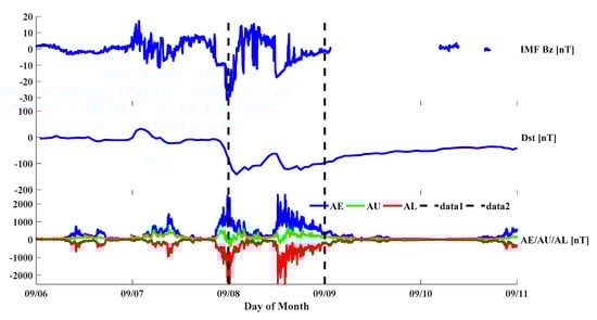 A strong geomagnetic storm struck on 7 September 2017 and lasted two days, as shown in Figure 3. To study this geomagnetic storm, the corresponding geomagnetically quiet days were selected within the month, with international days of geomagnetic quiescence as references. From the ISGI reports, they were selected from 8 to 10 August 2017. The IMF Bz is used to show the commencement of geomagnetic storm, when its value suddenly drops and reaches minus ten to twenty nT. The Dst index takes the average of the horizontal geomagnetic components from the earth around equatorial region and indicates the intensity of a geomagnetic storm. When a geomagnetic storm occurs, the Dst index quickly drops below −50 nT, and even below −100 nT if it is a strong geomagnetic storm. The AE index denotes the initiation of the auroral electrojet and measures the auroral zone magnetic activity produced by enhanced ionospheric currents flowing below and within the auroral oval. The AE index is calculated by the largest and smallest values of geomagnetic variations in horizontal component, which are observed at selected (10 to 13) observatories along the auroral zone in the Northern Hemisphere. The AU and AL indices are defined by the above largest and smallest values, respectively, and the difference between AU and AL defines the AE index.