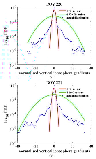 Probability density function of the ionospheric gradient derived during the geomagnetically quiet days. (a) 08–08 corresponding to day 220 of the year; and (b) 08–09 corresponding to day 221 of the year. The red curve indicates the 1 Gaussian distribution PDF, the green curves indicate the bounded Gaussian distribution PDFs with inflation factors of 6.95 (a) and 8.1 (b), and the blue dots are the real gradients derived from observables. The inflation factors are different between the two geomagnetic quiet days.