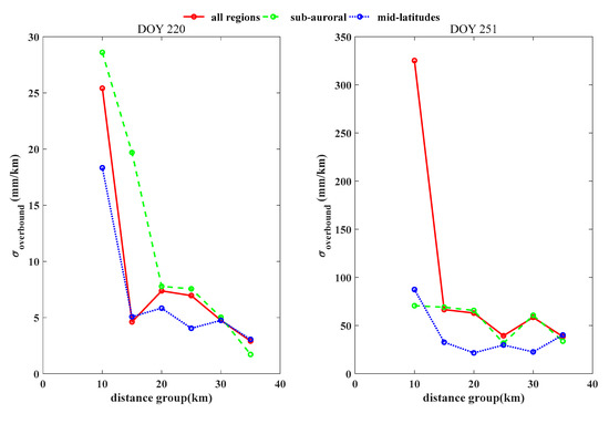 The results in Table 4 show the overbound values during the geomagnetic storm. The values increased greatly in all the regions on 8 September, when the geomagnetic storm was dominant. The values in the auroral region exhibited the largest increment, reaching as high as 365.64 mm/km; however, contrary to the results during the days of geomagnetic quiescence, the values in the middle latitudes exceeded those in the sub-auroral region, indicating a strong disturbance of the ionospheric TEC in the middle latitudes under the geomagnetic storm, whereas the values in the sub-auroral region were also enhanced, although not as greatly. A probable explanation is that during the geomagnetic storm, a substantial TEC depletion was registered in the sub-auroral region, leading to an ionospheric trough. The values decreased gradually when the distance was larger than 15 km in the sub-auroral region (from 50.98 to 11.01 mm/km on 7 September), while overbound values fluctuated with increasing distances on 8 September, showing strong ionospheric randomness brought on by the geomagnetic storm. Similar results were discovered in the middle latitudes. On all days during the geomagnetic storm, the overbound values continued to follow latitudinal variations and decreased from the auroral region to the middle latitudes. The standard deviation of the ionospheric gradient increased drastically to 107.48 mm/km in the auroral region on 8 September, almost four times the value on the previous day. The standard deviation of the ionospheric gradient decreased when the distance increased to larger than 5 km. A fluctuation was noticed when the distances increased to the range 15–20 km, the value was 9.73 mm/km which was a slight increment as compared with that at 10–15 km in the sub-auroral region on 8 September. A similar feature was noticed in the middle latitudes when distances increased to the range 20–25 km, the value was 5.00 mm/km as compared with 4.87 mm/km at the 15 to 20 km distance, and 4.97 mm/km at the range 10–15 km. Figure 7 further demonstrates the dependence of baseline distance and the , differnces of features were noticed between geomagnetic quiet day (doy 220) and the storm day (doy 251). The magnitude of increased greatly during the storm day, mostly contributed by the large in auroral region. The fluctuated with increment of the baseline distance after 15 km, and in general the magnitudes in midlatitudes were less than those in sub-auroral. For the geomagnetic quiet day, all the kept below 10 mm/km when the baseline distance was larger than 15 km.