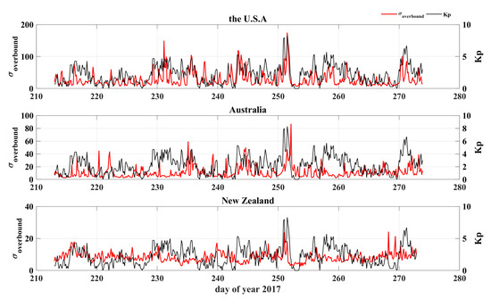 The overbound variability in relation to the Kp index for two-month durations (from 1 August to 30 September 2017). The red line indicates the overbound, and the black line indicates the Kp index. The results for the USA, Australia, and New Zealand are demonstrated. Large values correspond to large geomagnetic perturbations.